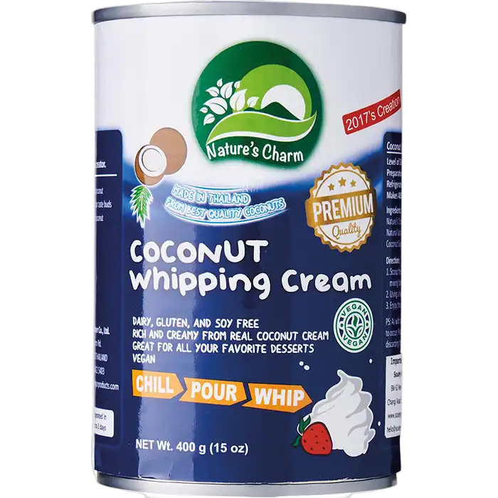 NATURE'S CHARME Kokosmilch zum Aufschlagen 400ml ist die ideale pflanzliche Alternative zu herkömmlicher Schlagsahne. Mit 90 % Kokosmilch, nativem Kokosöl und einem Hauch Kokosblütenzucker sorgt sie für eine wunderbar cremige, leicht süßliche Konsistenz. Perfekt geeignet als veganes Topping für Desserts, Kuchen oder Kaffee. Die Kokosmilch wird in Thailand produziert und ist frei von künstlichen Zusatzstoffen – für natürlichen Genuss ohne Kompromisse.